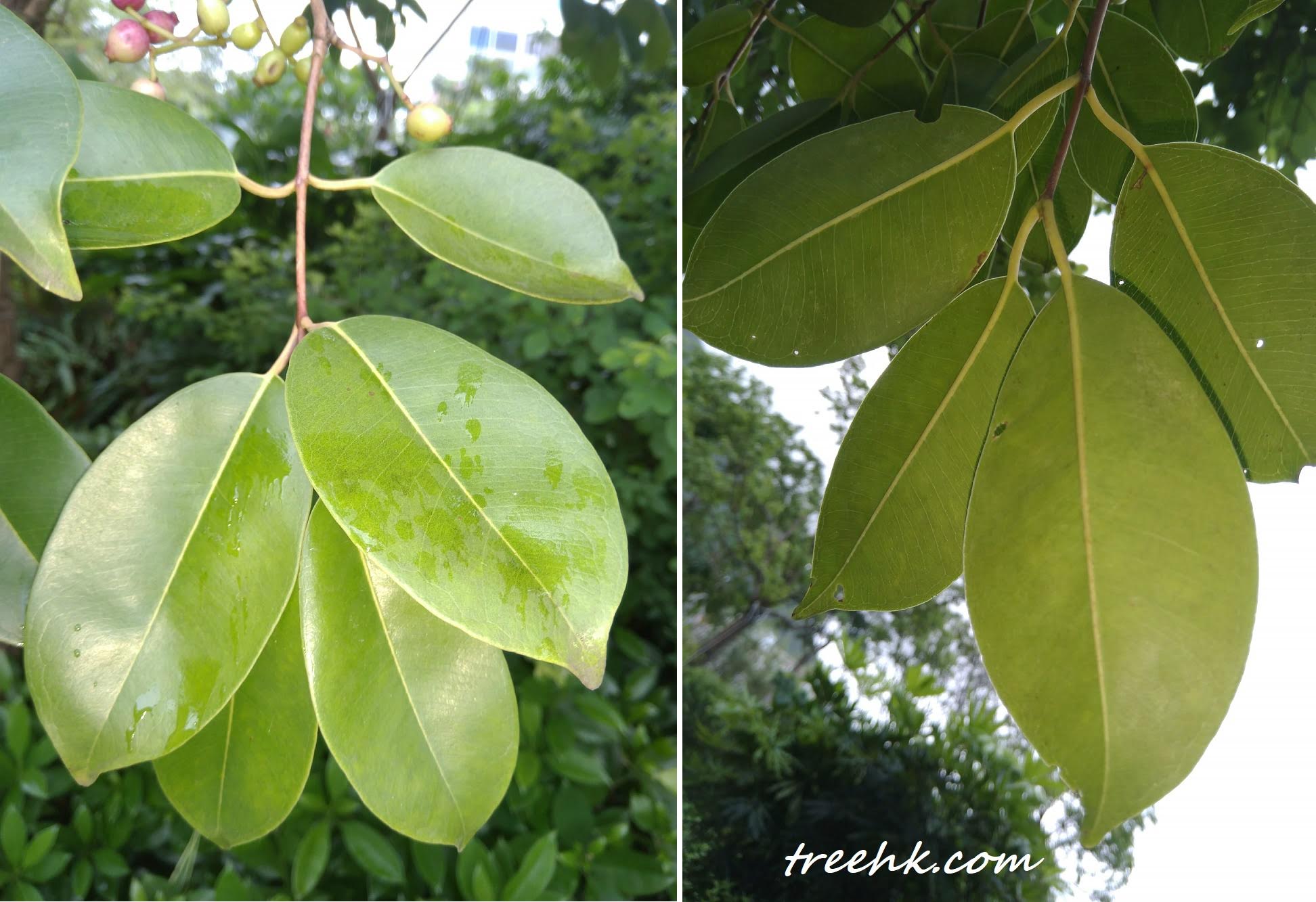 海南蒲桃樹葉頂端尖,葉有透明的腺體,光澤而帶革質