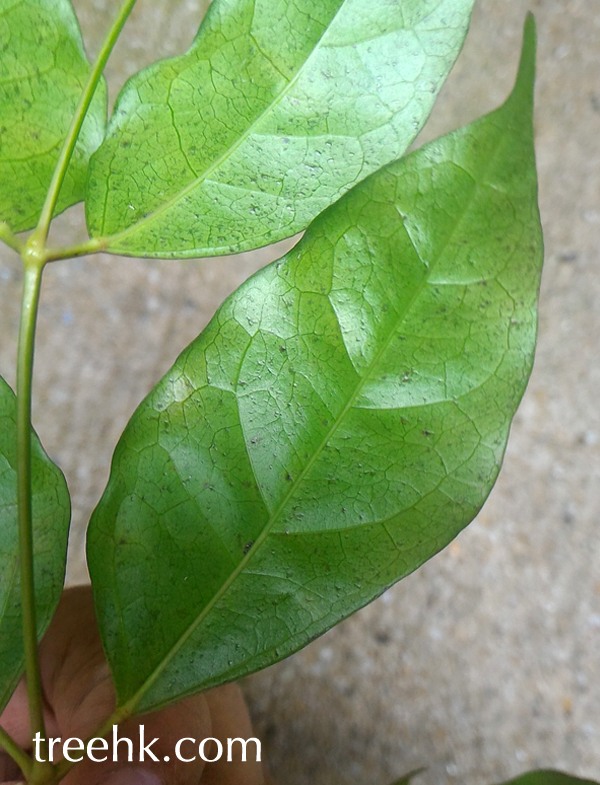 火燒花單葉對生,葉質似紙,葉子有柄,葉前端急尖 (acuminate),葉背色較淡。