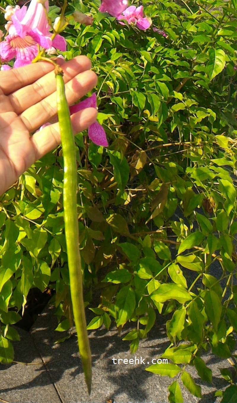 長長蒴果,在十一月左右出現,只是偶然看見一两條;種子棕色,紫雲籐果扁卵圓形,具有長方形的膜翅。