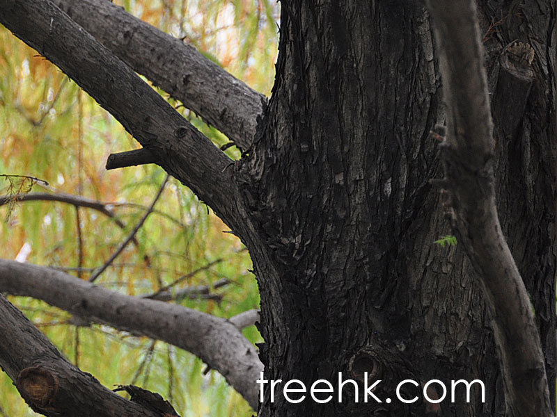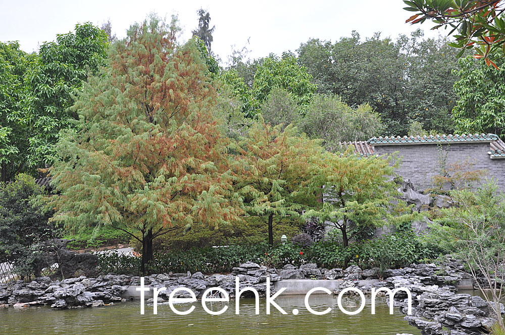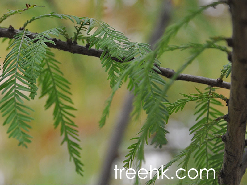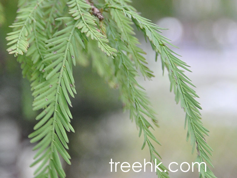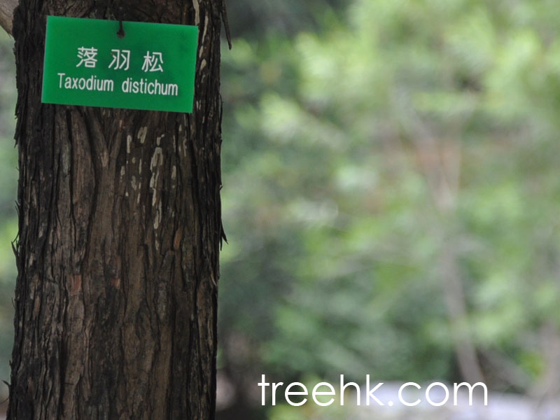 - 落葉大喬木,錐形,高可達45米,樹幹通直。顏色嫩綠外形,茂密。樹皮棕色,裂成長條片。