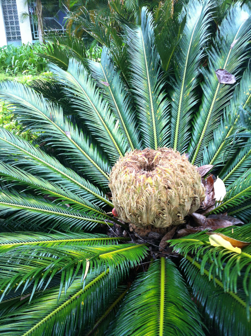 蘇鐵分為雌性和雄性,雄鐵樹的花是圓柱形的,雌鐵樹的花是半球狀的