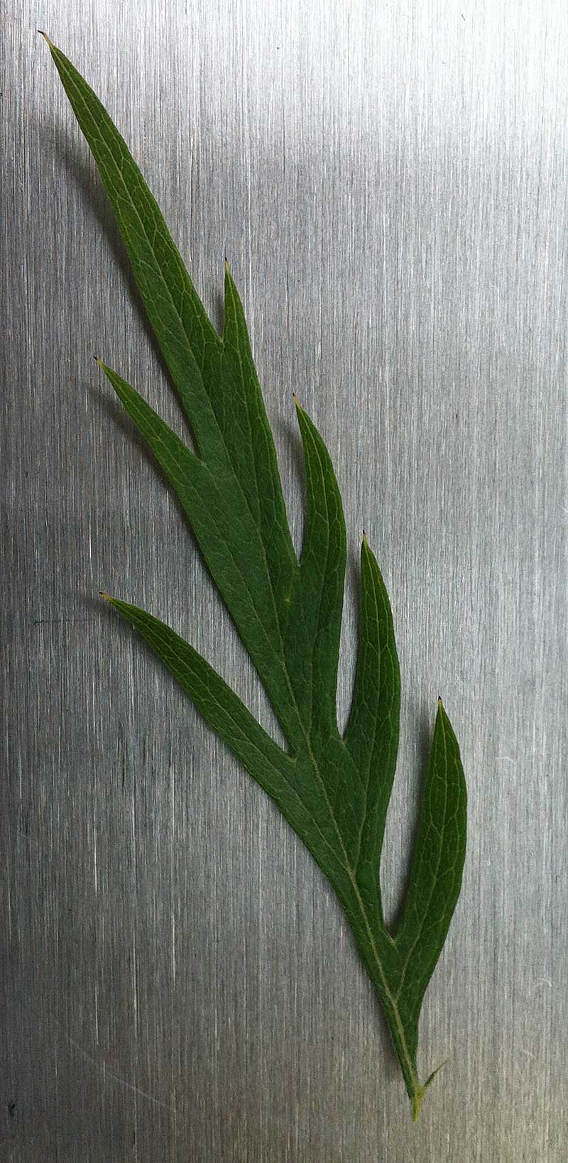 小葉極不對稱,邊緣深裂,先端狹窄急尖,基部漸尖削。葉面平滑光亮,呈深綠色;葉背披有細密的淡銀白色茸毛。