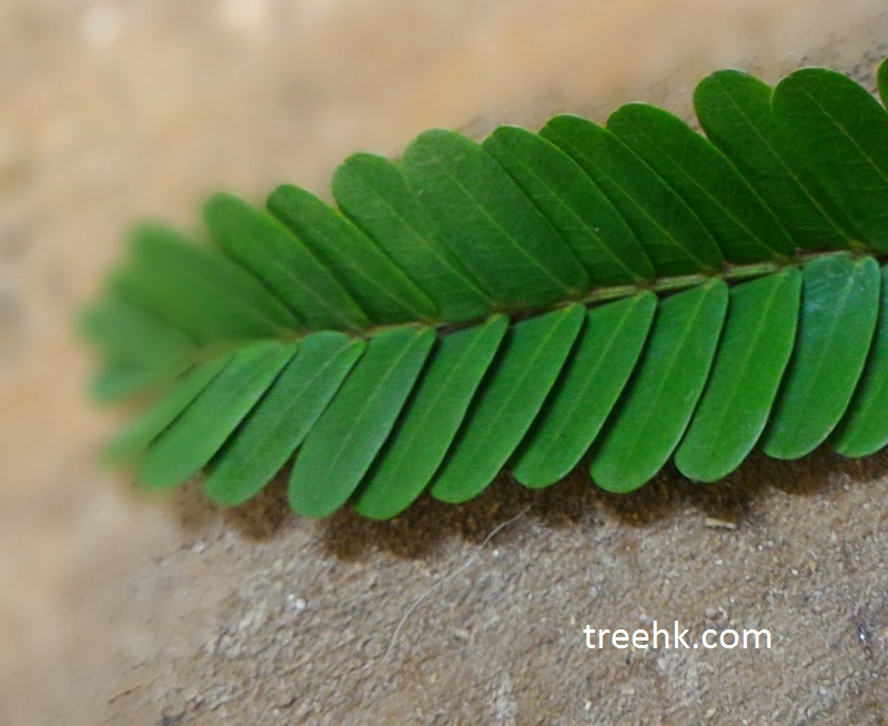 葉片較啞色,不甚明亮; 葉片鈍圆,微凹或有小凸尖。拍照時己近黃昏時份,羽葉片一一收摺起來,扁扁平平如一條線。