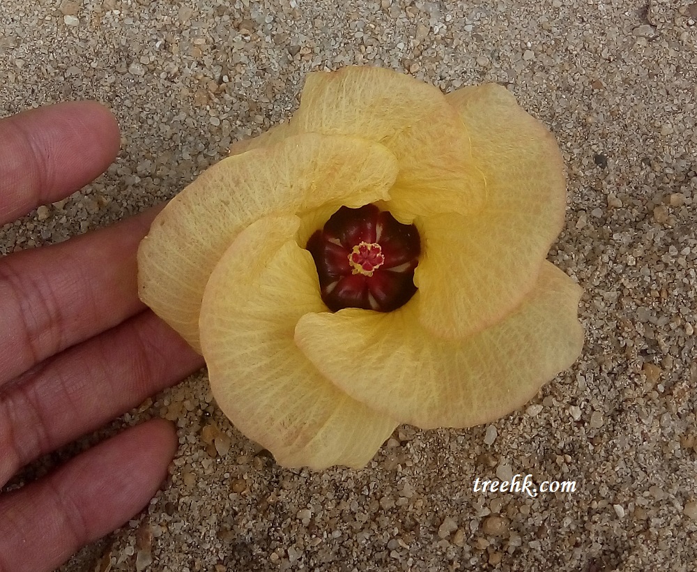 在市區看見的黃槿花朵大多是很細小,而且為數不多。今次有機會踫上幾棵大黃槿,又正值花期,從樹冠掉在泥上的黃槿花不少,樹上也掛滿了聚傘花序微微橙黃色的大花小花。類紅樹生長在後灘位置、真紅樹和陸地之間,雖不被海水浸沒,但能保護海岸免受巨浪破壞,有助維持海岸結構的完整。