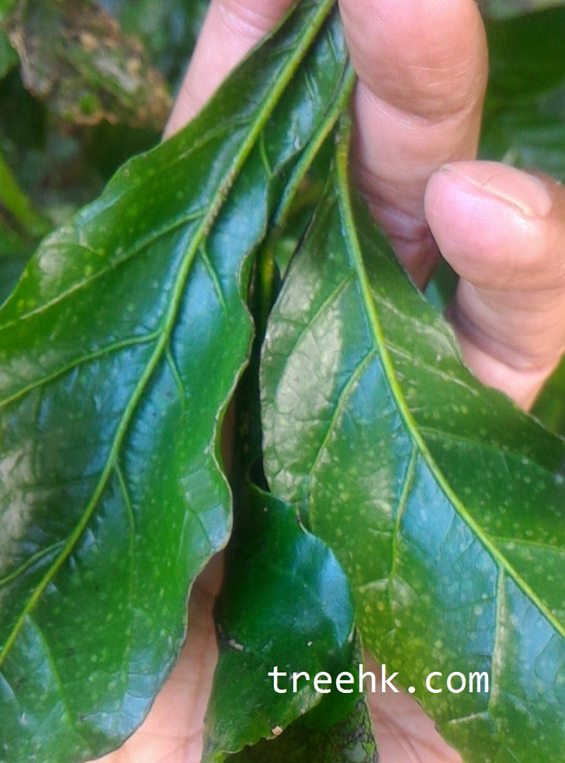 葉脈在葉面和葉底隆起突出,清晰可見,顏色墨綠,革質。