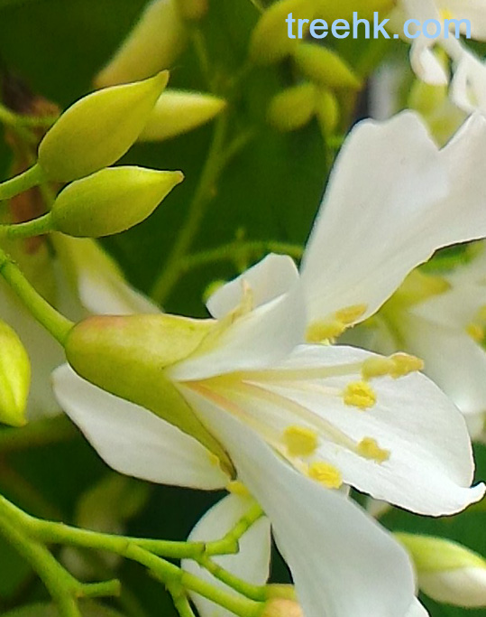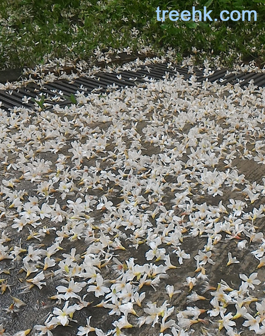 今年有機會看見另一棵千年桐 Vernicia montana – 油桐樹的親戚,可以在非常近的距離看到它。 花開璀璨,散在地上,鋪了一大片雪白; 雄花蕊红,雌花蕊黄。花期很短,只持續一兩個月。雖然樹身部份已枯,修剪不當 :-(,但整體樹形也不俗,婆娑有致,葉片亦壯大蔥綠。