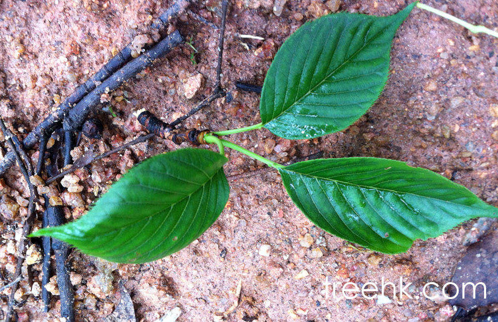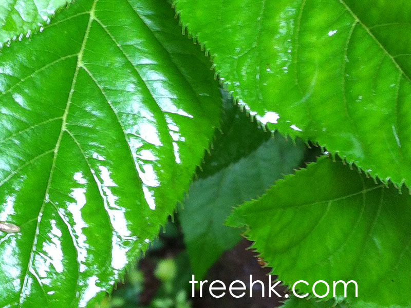 葉片卵狀橢圓形或倒卵橢圓形,邊有漸尖單鋸齒及重鋸齒,齒尖有小腺體,上面深綠色,無毛,下面淡綠色,無毛