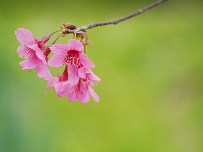 每年一至四月開花,開花期不長葉子,花色多為深桃紅色,三到五朵共生,並有下垂性,多為單瓣