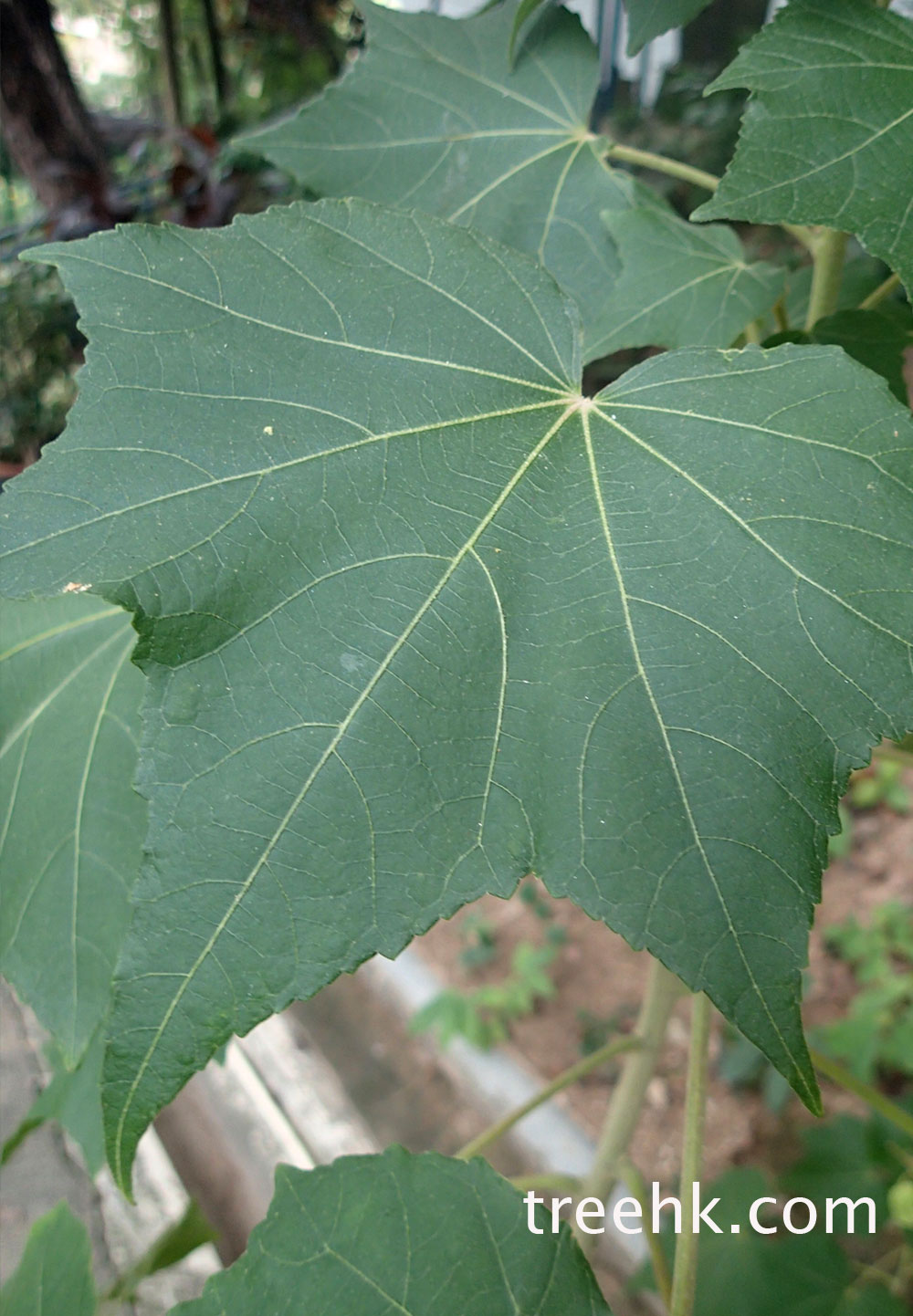 葉緣有圓形鋸齒,葉片頂部尖起。葉眽兩面都會很明顯,由底部分义七條向上伸展。葉柄長,葉片可以有手掌般大小。