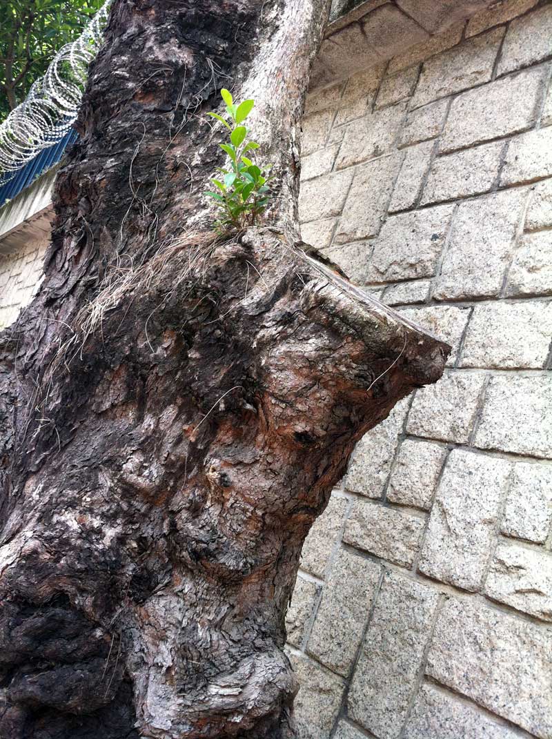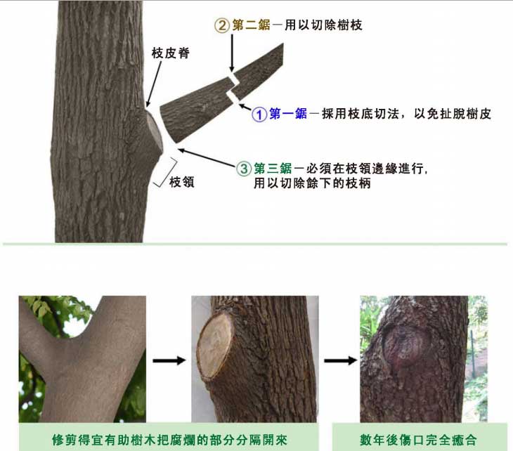 樹側枝直徑超過10厘米以外,便要用連三鋸式。在修枝時,要找出樹枝和樹幹接合處的梁脊位,即BBR, 靠近基部之枝瘤微隆部份,將鋸口稍微向外傾斜切鋸,避開枝瘤,切口要小。超過10 厘米直徑枝條不建議修枝。詳情可以到香港特區政府的樹木管理辦事處一套指引 。
