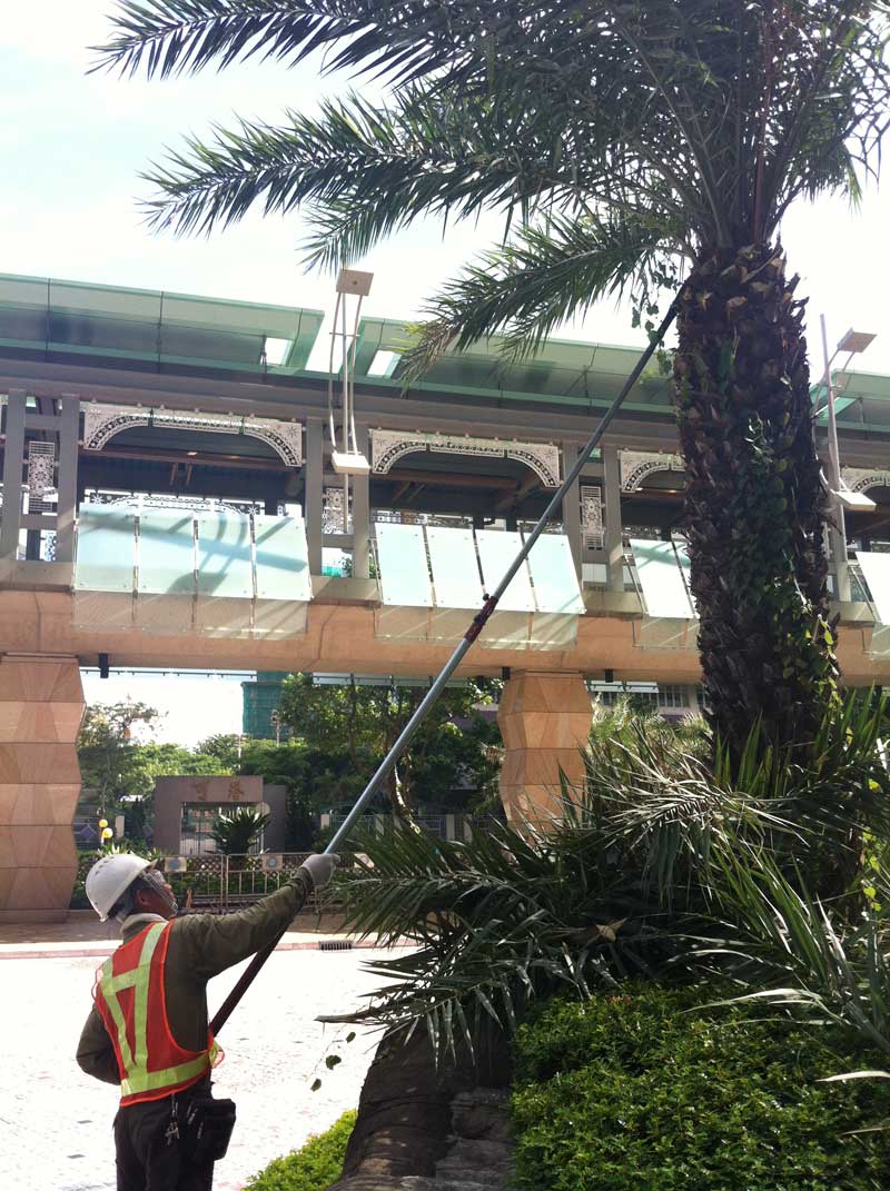 開始用時只著意盡快將高空鋸掛在樹叉上,沒有注意鋸片方位和身體用力角度,很快便手軟身痛。站在旁邊的輝哥大大聲叫道:注意身體的站立姿勢,順著刀鋸的角度,順序定、放、停、鋸,才不會消耗體能。
