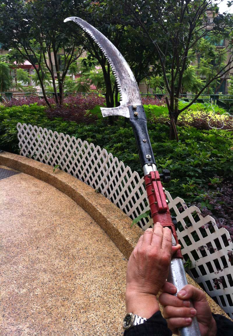在操作高空鋸時,只靠一股牛力維持不足一刻。試想想這柄鋸, 狀似關公手持青龍偃月刀,重十幾磅,將它完全展開來,可長逹五、六米,凌空舉起掛在樹枝交接處往左往右開工,樹枝從高空剝落,長鋸亦會下墜,就算雙手緊執柄尾,也要用力穩定長鋸下墜速度,免得硬著陸。