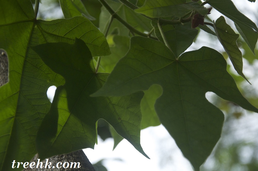 澳洲蘋婆葉似楓葉,呈掌裂狀,兩側葉脈清楚可見。據說在天氣轉冷時會變成紅色,這點仍待確定。