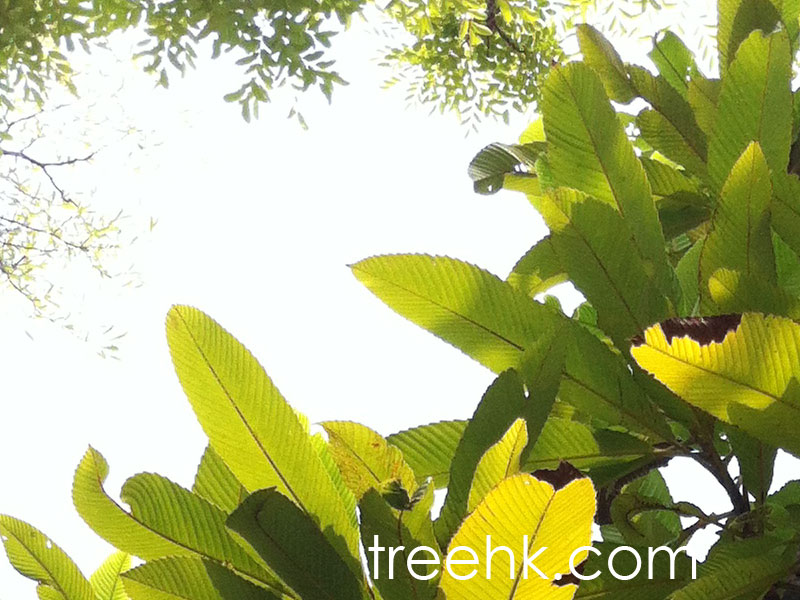 第倫桃單葉,互生,葉柄短,葉片可大至超過手掌長度,而且在枝頂茂密。