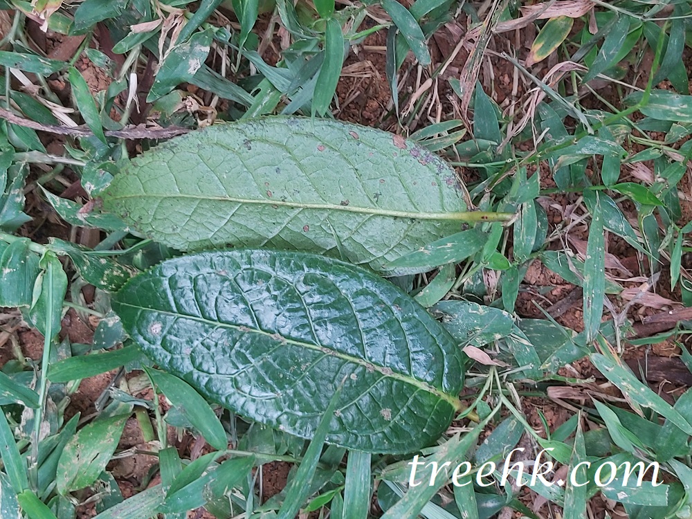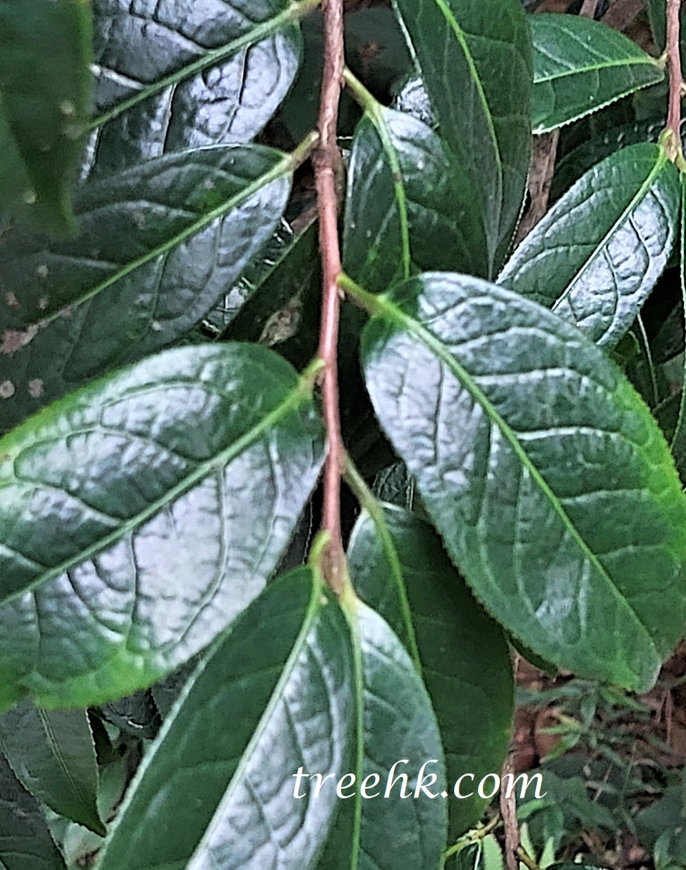 紅皮糙果茶革質樹葉,葉面好像塗上一層漆,亮眼墨綠,可以防止失去水份昆蟲嚙食。