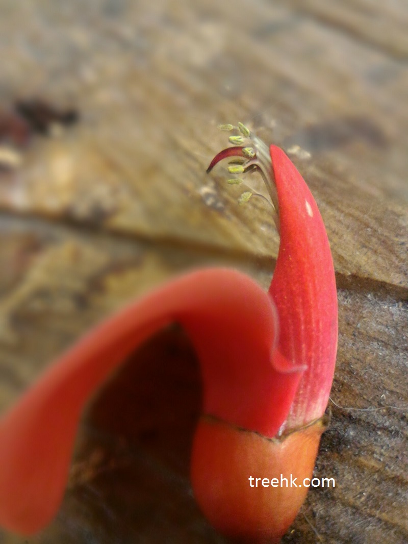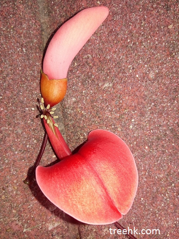 未拾取花朵時,他像其他常見的刺桐植物一樣,但已開的花朵可是不太像: 他有一瓣特大的紅舌 -應該是” 旗瓣”,掉在地上也十分搶眼,拍了下來作紀念。此外,還有類似的刺桐屬植物: 象牙花龍牙花