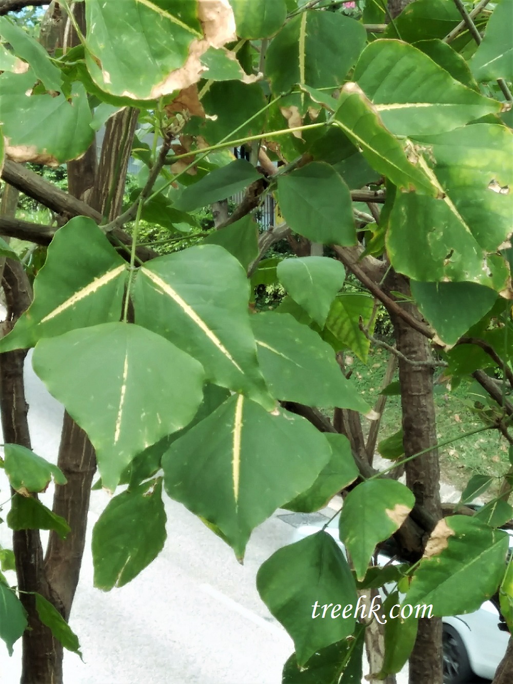菱形葉片,附在長柄上,葉脈明顯中間是悦目的黃色。