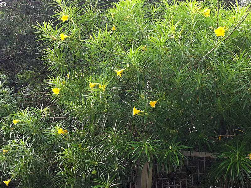 黃花夾竹桃花簇生在枝頂,呈黃色漏斗形,芬芳。
